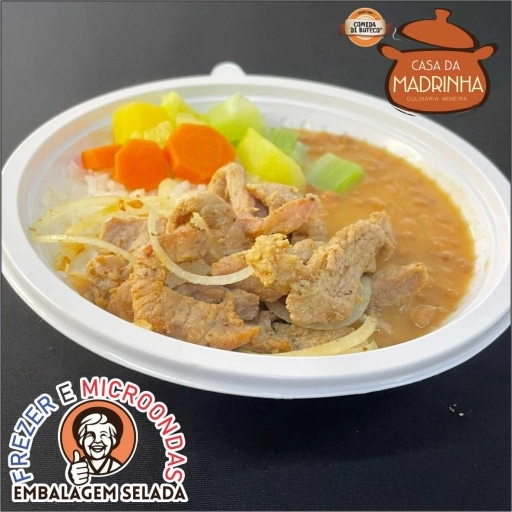 Arroz, feijão, macarrão do dia e legumes do dia.