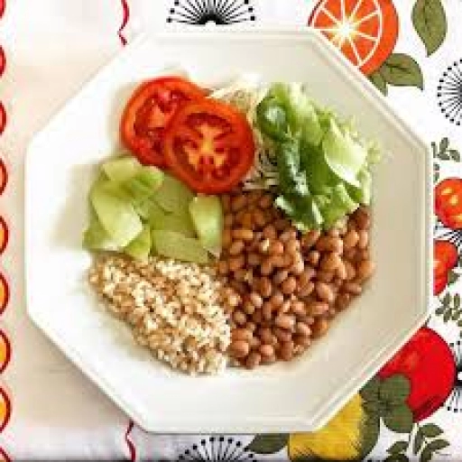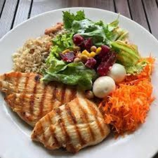 Arroz integral, legumes salteados variados, salada variada e proteina a escolha.